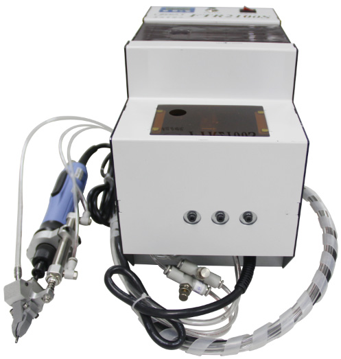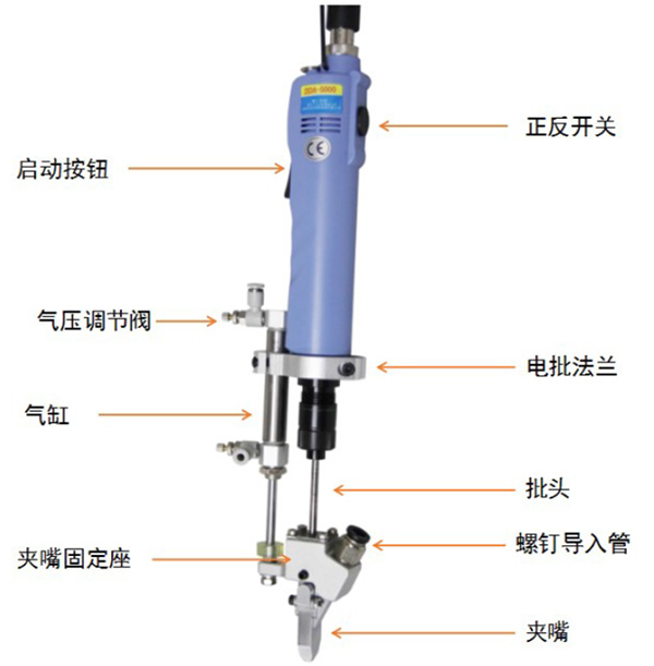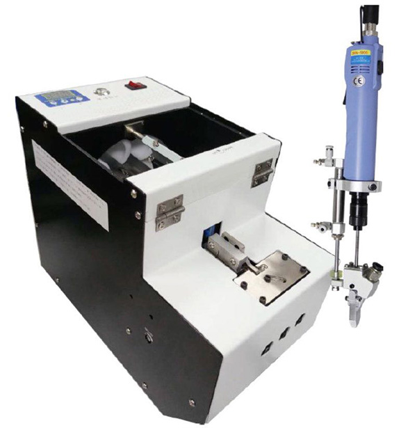 設(shè)備有送料機構(gòu)、分釘機構(gòu)、鎖付機構(gòu)、氣控系統(tǒng)、電控系統(tǒng)組成。螺釘采用自動分料裝置自動排序、分料、送料。工件由操作人員預(yù)組裝定位,然后手持伸縮式電動(或氣動)螺絲刀對準(zhǔn)螺孔位置,下壓螺絲刀,啟動電動(風(fēng)動)馬達,螺絲刀旋轉(zhuǎn)并將螺釘擰緊,達到設(shè)定扭力后,自動停止;提起螺絲刀,同時有一顆螺釘自動吹送到定位夾嘴中定位。